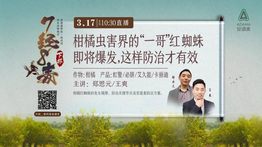 柑橘红蜘蛛的防治难点是什么?溃疡病防治药剂琳琅满目,如何更好搭配?在当下柑橘管理过程中,很多种植户都会有这些疑惑?别担心,三堂实用免费课程来了!教你如何更好管理,种出优质果!为冲破疫情影响,更好为柑橘果农服务,安道麦将于3月11日(明天)、3月17日、3月19日,精心推出融入武侠元素的柑橘农技直播活动——“7经8麦”,由多位柑橘植保高手授课,带领广大果农朋友一起攻读柑橘武林绝学。