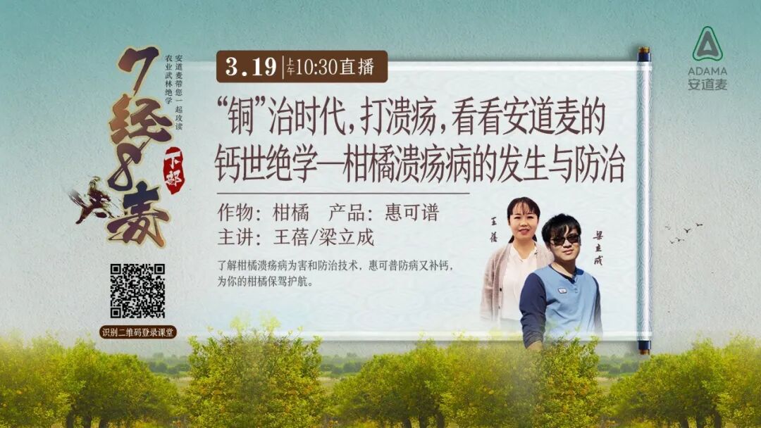 溃疡病防治药剂琳琅满目,不知怎么选择搭配使用才适合自己的果园?果园按时喷药为什么依然没防住?...在防治柑橘溃疡病方面,你是不是也同样存在这些疑惑?不要担心,3月19日,安道麦精心推出《“铜”治时代,打溃疡,看看安道麦的钙世绝学》课程,带你深入了解柑橘溃疡病的发生规律、传播因素、综合防治策略以及如何选择不同类型铜制剂,现场答疑解惑,让果农防治柑橘溃疡病不再难,直播间不见不散!