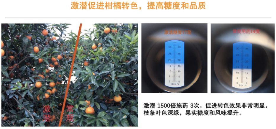 此外,安道麦新发布的一款源自智利的生物刺激物产品激潜(生物刺激物·钾)在提升柑橘品质方面同样表现不俗,可有效促进柑橘转色,提升糖度。枝条叶色和对照相比也有明显的差异。